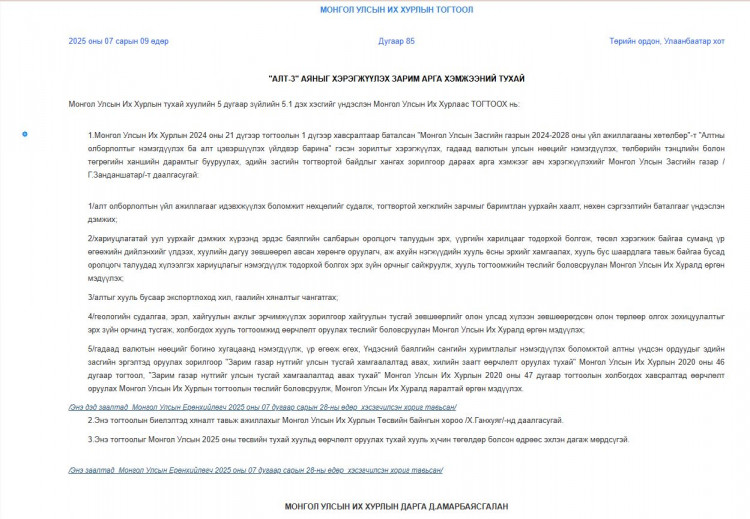 Монгол Улсын Их Хурлын 2025 оны намрын ээлжит чуулганы энэ өдөр (2025.09.23)-ийн нэгдсэн хуралдаанаар “Алт-3” аяныг хэрэгжүүлэх зарим арга хэмжээний тухай УИХ-ын 2025 оны 85 дугаар тогтоолд хэсэгчлэн тавьсан Монгол Улсын Ерөнхийлөгчийн хоригийг УИХ хэлэлцлээ.