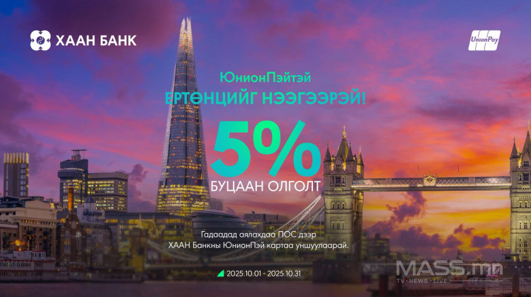 Та хэрэв гадагш аялахаар төлөвлөж байгаа бол, хурал уулзалт, аливаа арга хэмжээнд оролцохоор хилийн дээс алхах гэж байгаа бол 2025 оны 10-р сарын 1-31-ний хооронд ХААН Банкны ЮнионПэй картаараа олон улсын ПОС төхөөрөмжөөр хийсэн худалдан авалт бүрдээ үнийн дүнгийн 5%-ийг буцаан авах боломжтой.
