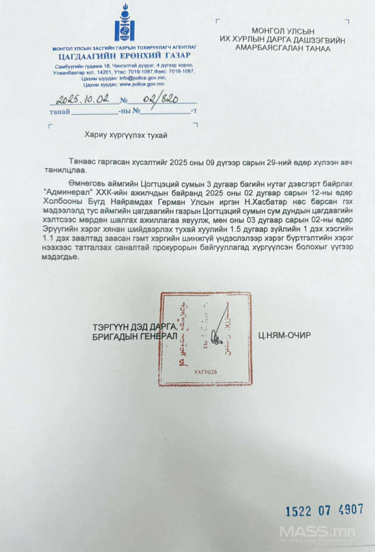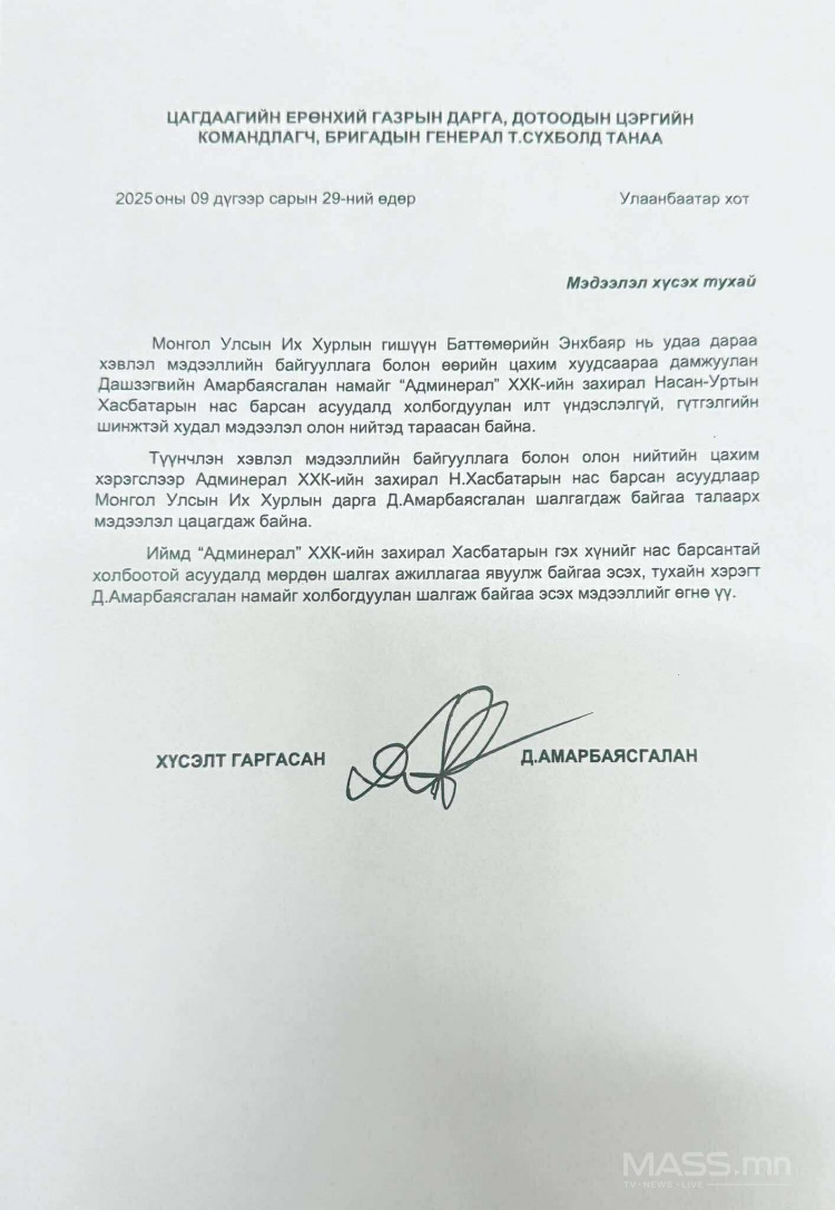 Амарбаясгалан намайг ямар нэг байдлаар энэ хэрэгтэй холбоотой мэдээлэл аваагүй, гэрчийн болон бусад хэлбэрээр дуудаж шалгаагүй. Намайг гүтгэгч этгээд 30 сая ам.долларыг ковидын үеэр оруулж ирээд, материалыг мэдсэн хүнийг нухсан мэтээр нэвтрүүлэгт орохдоо хэлж гүтгэсэн. Өнөөдөр би эрх мэдлийн төлөө гүтгүүлж доромжлуулж байгаагаа хүлээн зөвшөөрөхгүй. ЭХХШТХ-ийн 30.10-р зүйл дээр мөрдөгчийн хэрэг бүртгэхээс татгалзсан зүйл дээр прокурор 7 хоног шалгаад хаана гэсэн байдаг.Тэгэхээр энэ хэрэг хаагдсан байна. Талийгч этгээдийн ар гэр хэвлэл мэдээллийн хэрэгслээр дамжуулан олон материал ирүүлсэн байдаг. Миний нөхрийн үхэл ямар нэгэн гэмт хэргийн шинжтэй байгаагүй нь тогтоогдсон гэдгээ ч хэлсэн.