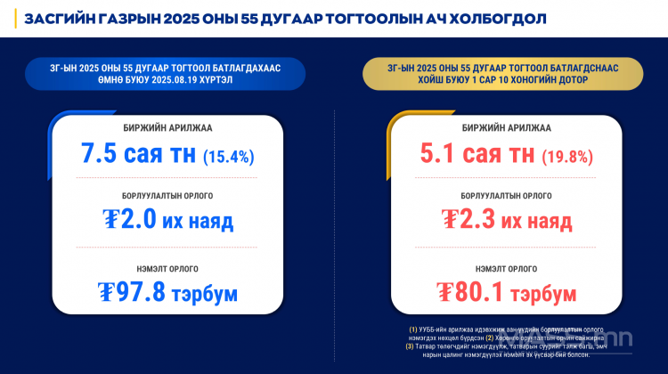 АҮЭБ-ийн сайд Г.Дамдинням ЗГ-ын 55-р тогтоолын талаар мэдээлэл хийлээ. Тэрбээр "МУЗГ-ын 55-р тогтоол энэ удаад 10 дахь удаа гарч байгаа юм. Өмнө нь 9 удаа гарч байсан гэсэн үг. Биднийг ажил авахад биржийн арилжаа зогссон, хасах эдийн засагтай засаг хүлээж авсан. Биржийн арилжаа нийт экспортын 10 хүрэхгүй хувийг эзэлдэг, цалин, тэтгэвэр, төрийн албан хаагчдын цалин орж ирэхгүй гацсан нөхцөл байдалтай бид хүлээж авсан. Төсөвт хөрөнгө мөнгө оруулж ирдэг салбарын сайдын хувьд хоёр ч тогтоол батлуулж эдийн засгийг эерэг үр дүнтэй болголоо.