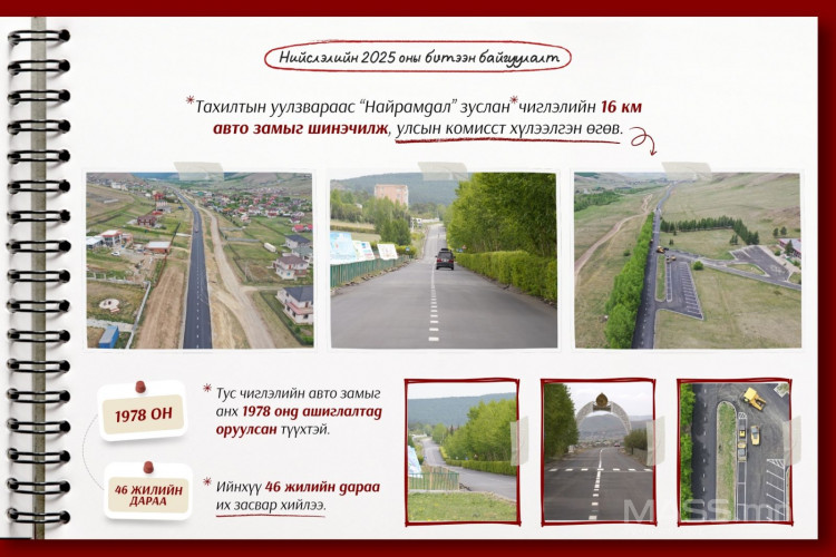 Сонгинохайрхан дүүргийн 22, 34 дүгээр хороо, Тахилтын уулзвараас “Найрамдал” зуслан чиглэлийн 16 км урт, хоёр эгнээ бүхий авто замыг бүрэн шинэчилж, улсын комисст хүлээлгэн өгөөд байна. Тодруулбал, 2024 оны есдүгээр сараас тус авто замыг шинэчилж эхэлсэн бөгөөд өнгөрсөн онд 4 км авто замыг шинэчилсэн юм.