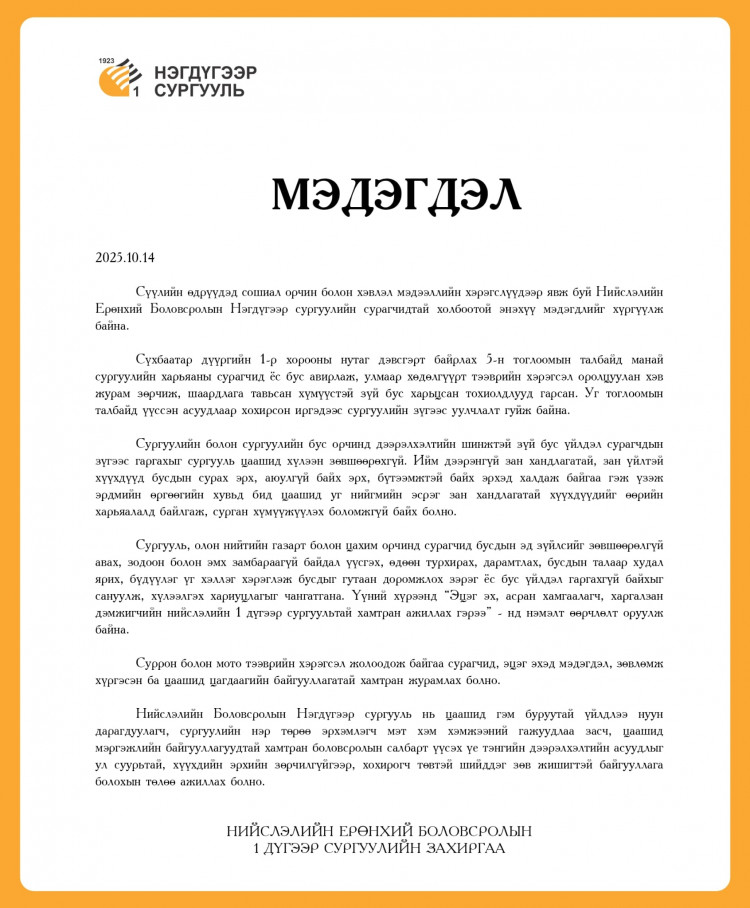 Сүүлийн өдрүүдэд сошиал орчин болон хэвлэл мэдээллийн хэрэгслүүдээр явж буй Нийслэлийн Ерөнхий Боловсролын Нэгдүгээр сургуулийн сурагчидтай холбоотой мэдээлэлтэй холбогдуулан тус сургуулиас мэдэгдэл гаргалаа.