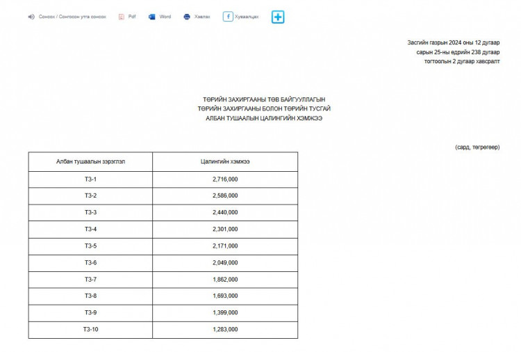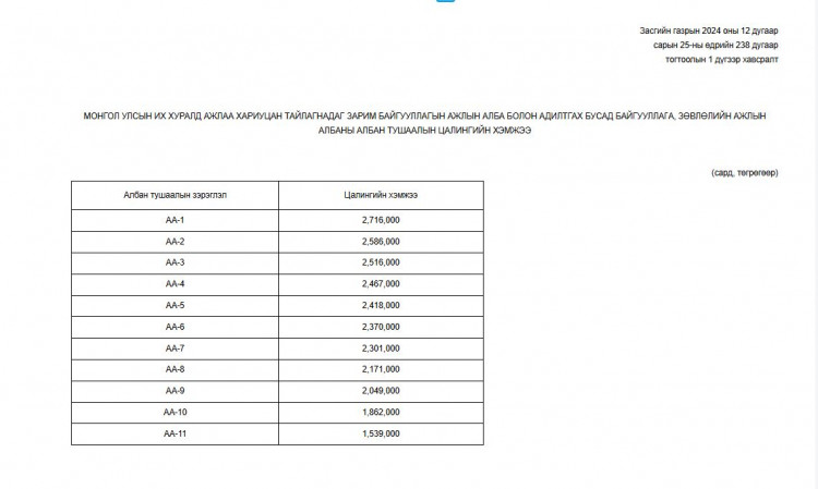 Төрийн албаны зарим албан тушаалын цалингийн хэмжээ, доод хэмжээг шинэчлэн тогтоох тухай Засгийн газрын 2024 оны 12 дугаар сарын 25-ны өдрийн тогтоол байдаг. Уг тогтоолын хавсралтад салбараар нь жагсаасан цалинг сонирхож үзвэл АА буюу УИХ-д ажлаа тайлагнадаг байгууллагууд зарим байгууллагын ажлын алба болон адилтгах бусад байгууллага, зөвлөлийн ажлын албаны болон төрийн захиргааны, төрийн тусгай албан тушаалтнууд, Засгийн газрын агентлаг болон нутгийн төрийн захиргаа, төрийн захиргааны бусад албан тушаалтнуудын цалин нэг сая 539 мянгаас эхлээд хоёр сая 716 мянган төгрөг хүртэл байна. 11 зэрэглэлийн ес нь хоёр сая төгрөгөөс дээш байгаа юм.