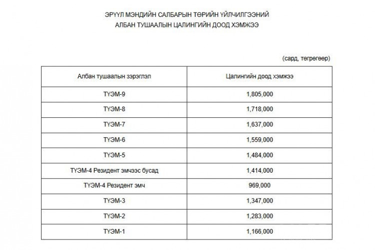 Тэгвэл эрүүл мэндийн салбарын төрийн үйлчилгээний албан тушаалын цалингийн доод хэмжээ нэг сая 166 мянгаас нэг сая 805 мянган төгрөг хүртэл байна. Дотроо 10 зэрэглэлтэй бөгөөд бүгд хоёр сая төгрөгөөс доош үнэлгээтэй байгааг та бүхэн харж байна. Тус салбарынхны хамгийн өндөр цалин 1.8 сая төгрөг байх бөгөөд зөвлөх эмч нар энэ хэмжээгээр цалинждаг аж.