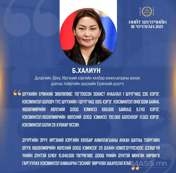 Энэхүү хууль хяналтын байгууллагын олон жилийн хөдөлмөрийг үнэгүйдүүлэх шүүх хуралдааныг Дүүргийн эрүү, иргэний хэргийн хялбар ажиллагааны анхан шатны тойргийн Ерөнхий шүүгч Б.Халиун гэгч даргалсан аж. Оюутолгой ХХК гэлтгүй ханган нийлүүлэгч нарын дунд цуутай Д.Амартүвшинг сулласан нь маш том хардлага төрүүлэх сэжүүр болж буй нь та бидний нүдэнд илхэн бизээ.