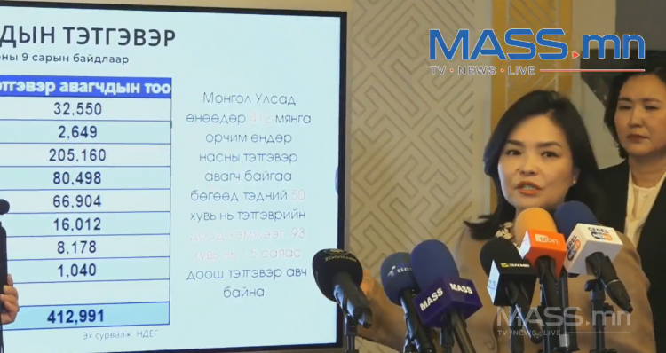 УИХ-ын гишүүн Д.Энхтуяа, Б.Пунсалмаа, Б.Пунсалмаа нар тэтгэвэртэй холбоотой мэдээлэл хийлээ. Д.Энхтуяа "Ирэх оны төсөв батлагдах гэж байна. Төсөвтэй холбоотой олон асуудал гарч ирж байна. 9.15-наас ахмадууд хүчтэй тэмцэл өрнүүлсэн. АН-ын эмэгтэйчүүд ахмадын тэтгэврийн талаар дуу хоолойгоо өргөж ирсэн. Анхны төсвийн төслөөр ахмадын тэтгэвэр зургаан хувиар нэмэх төсөв орж ирсэн. Олон саналуудыг хэлснээр ахмадын тэтгэвэр 8.6 хувиар нэмэхээр болсон. Өнөөдөр 572 мянган төгрөгийн тэтгэвэртэй ахмад 32 мянга, 688 мянган төгрөг хүртэлх