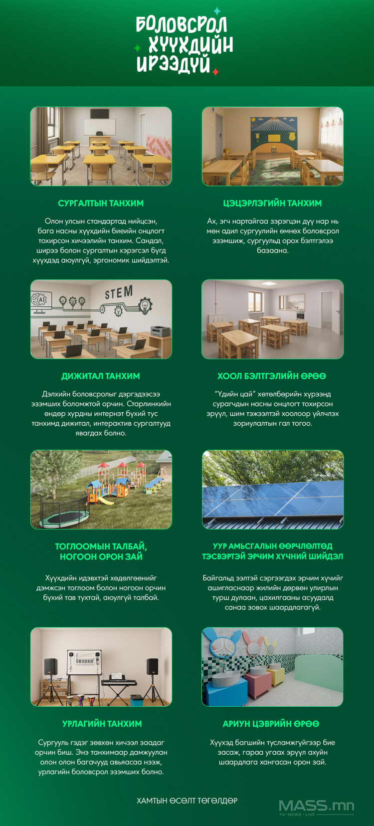 Иймд төв суурин газраас алслагдмал бүс нутагт амьдарч буй 6-10 насны бяцхан үрсийг гэрийнхээ ойролцоо суралцах нөхцөлөөр хангах зорилгоор энэхүү “Багийн бага сургууль” төслийг хэрэгжүүлж, зөвхөн хичээл заах сургалтын орчин төдийгүй хүүхдийн хөгжлийн иж бүрэн нөхцөлийг бүрдүүлсэн, байгальд ээлтэй сургууль, цэцэрлэгийн цогцолбор байгууламж барьж буй юм. Өөрөөр хэлбэл, тус цогцолбор нь олон улсын стандартад нийцсэн анги танхим, эрүүл ахуйн шаардлага хангасан ариун цэврийн өрөө, “Үдийн цай” хөтөлбөрийн хүрээнд эрүүл хоол бэлтгэх зориулалтын гал тогоо, урлаг болон спортын танхим, Starlink өндөр хурдны интернэттэй цахим орчин, хүүхдийн идэвхтэй хөдөлгөөнийг дэмжсэн тоглоомын талбай, сэргээгдэх эрчим хүчний шийдэл бүхий ногоон байгууламж зэрэг дэд бүтцийг нь иж бүрэн шийдэж өгснөөрөө онцлог юм.
