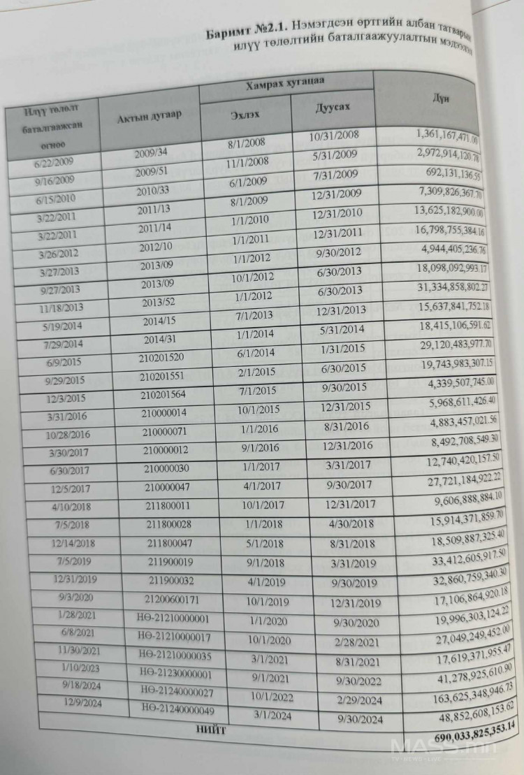 Дээрх зохицуулалтын дагуу татварын албанаас хянан баталгаажуулалт хийдэг бөгөөд Эмхэтгэлд дурдсан 2008-2025 оны туршид тухай бур хянан баталгаажуулсны үндсэн дээр бусад татварын өрөнд суутган тооцсон байна.