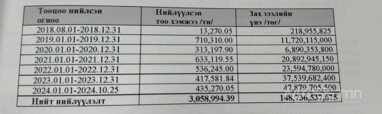 “Энержи Ресурс” ХХК нь 2018-2024 оны хооронд 7 жилийн турш нийт 3,058,994,39 тонн баяжуулсан эрчим хүчний нүүрс /мидлинг/-ийг шахмал түлш үйлдвэрлэх зориулалтаар төрийн өмчит “Тавантолгой түлш” ХХК-д үнэ төлбөргүйгээр нийлүүлсэн. Энэ нь дотоодын зах зээлийн үнээр нийт 148,736,537,675 төгрөг байна.