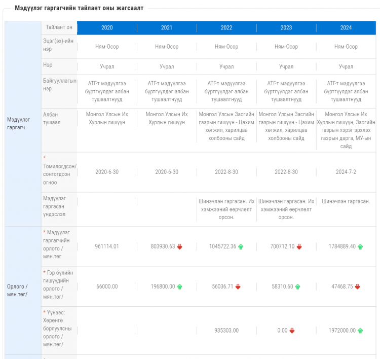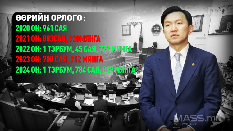 Түүний орлого 2020 онд 961 сая байсан бол 2021 онд 803 сая 930 мянган төгрөг болж буурчээ.