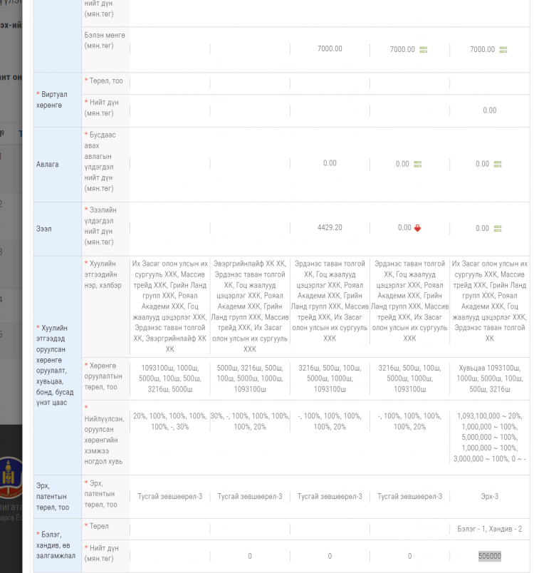 Патент, эрх: Гурван эрх эзэмшдэг, бэлэг болон хандиваар 506 сая төгрөг хүлээн авсан хэмээн мэдүүлжээ.