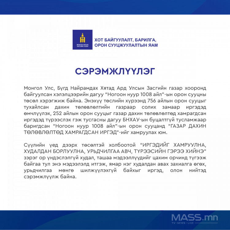 Сэрэмжлүүлэгт "Монгол Улс, БНХАУ-ын Засгийн газар хооронд байгуулсан хэлэлцээрийн дагуу "Ногоон нуур 1008 айл"-ын орон сууцны төсөл хэрэгжиж байна. Энэхүү төслийн хүрээнд 756 айлын орон сууцыг тухайлсан дахин төлөвлөлтийн газраар солих замаар иргэдэд өмчлүүлэх, 252 айлын орон сууцыг газар дахин төлөвлөлтөд хамрагдсан иргэдэд түрээслэх гэж тусгасны дагуу БНХАУ-ын буцалтгүй тусламжаар баригдсан "Ногоон нуур 1008 айл"-ын орон сууцанд "ГАЗАР ДАХИН ТӨЛӨВЛӨЛТӨД ХАМРАГДСАН ИРГЭД"-ийг хамруулах юм.