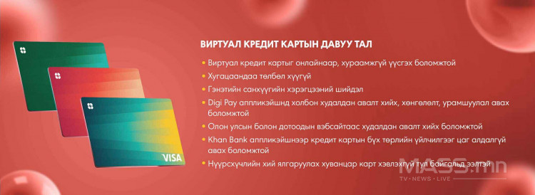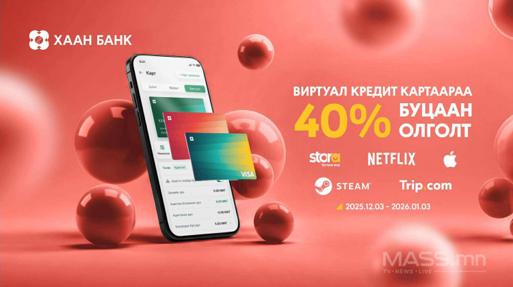 Энэхүү картаа та онлайнаар буюу Khan Bank аппликэйшнээрээ ямар ч хураамжгүй үүсгэх боломжтой бөгөөд 2025 оны 12-р сарын 3-аас 2026 оны 01-р сарын 3-ны хооронд Stora, Netflix, Trip.com, Apple, Steam - вэбсайтаас энэхүү виртуал кредит картаараа худалдан авалт хийгээд 40%-ийн буцаан олголт авах боломжтой. Буцаан олголт 2026 оны 1-р сарын 8-ны өдөр таны дебит дансанд шилжин орно.