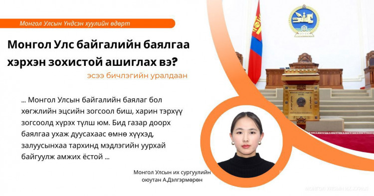 Монгол Улсын Үндсэн хуулийн өдөрт зориулан Улсын Их Хурлын Тамгын газар, Парламентын судалгаа, хөгжлийн хүрээлэнгээс зохион байгуулсан “Монгол Улс байгалийн баялгаа хэрхэн зохистой ашиглах ёстой вэ” сэдэвт уралдааны их, дээд сургуулийн оюутны ангилалд тэргүүлсэн Монгол Улсын их сургуулийн оюутан А.Дэлгэрмөрөнгийн эсээг толилуулж байна.