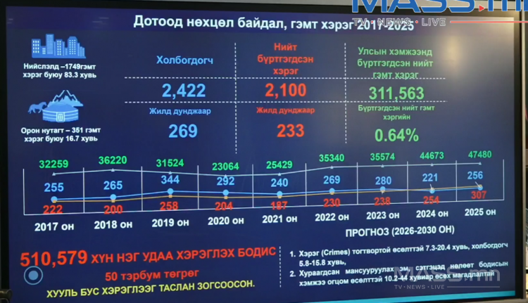 Сүүлийн 9 жилийн статистикийн гаргасан. Нийт 2422 холбогдогчтой 2100 хэрэгт мөрдөн шалгах ажиллагаа явуулсан. Энэ нь нийт гэмт хэргийн 0.63 хувийг эзэлж байна. Нийслэлд 1749 гэмт хэрэг, орон нутагт 361 хэрэг бүртгэгдсэн.