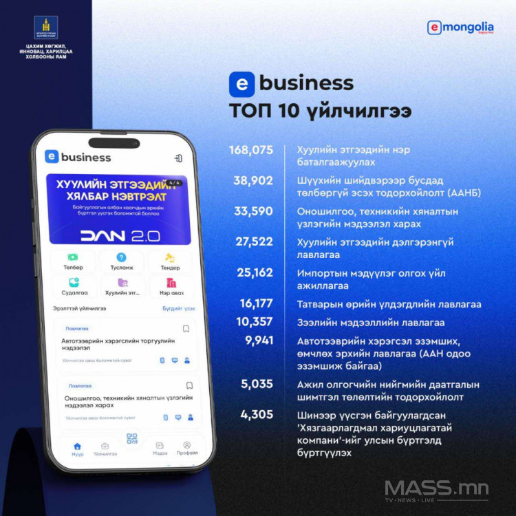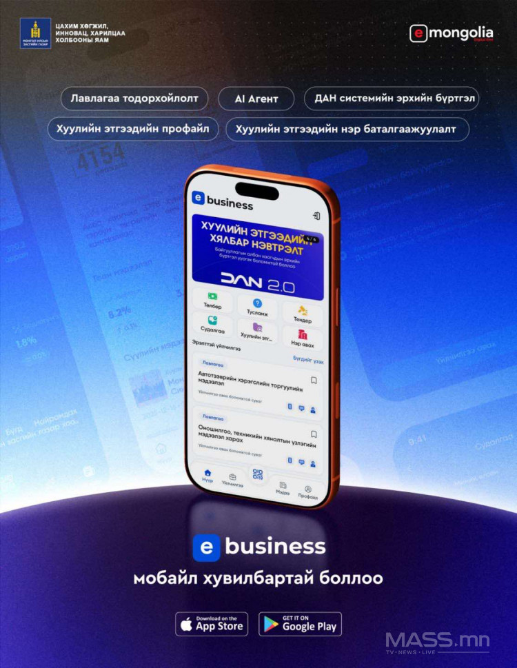 "Төрийн үйлчилгээний нэгдсэн E-Business платформ мобайл аппликейшн 2026.01.30-ний өдрөөс хэрэглээнд нэвтэрсэн байна.