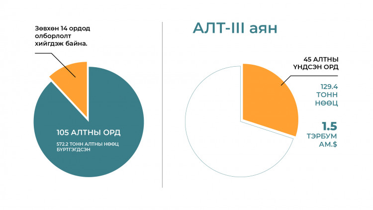 Үүний хамгийн том хөшүүрэг нь “Алт-III” аян байх болно. Уг хөтөлбөр хэрэгжсэнээр дунд хугацаандаа 45 алтны үндсэн ордын нийт 129.4 тонн нөөцийг эдийн засгийн эргэлтэд оруулж, тушаах алтны хэмжээ жилд 10 тонноор нэмэгдэнэ гэж тооцоолж байна.