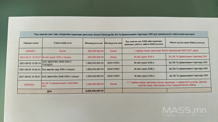 УИХ-ын гишүүн Б.Пунсалмаагийн нөхөр Р.Батбаярын гарын үсэгтэй, нийт 6.800.000.000 /зургаан тэрбум найман зуун сая/ төгрөгийн дүн бүхий зургаан удаагийн гүйлгээ Хот байгуулалт, барилга, орон сууцжуулалтын сайд Э.Бат-Амгалангийн төрсөн дүүгийн эхнэр Э.Энхмаагийн “Би Эй Ти девелопмент партнерс” компанийн данс руу шилжүүлсэн баримт ил болов.