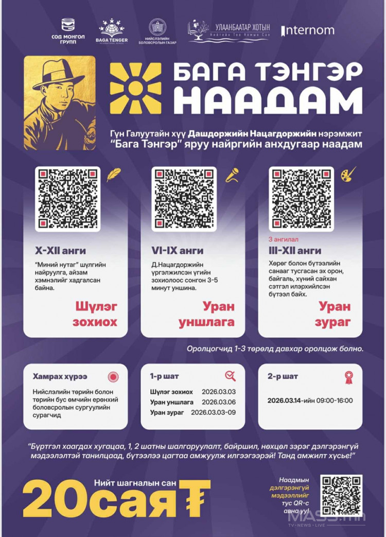 - Уран зураг (III–XII анги, насны 3 ангиллаар) оролцох бөгөөд шагналын сан 20 сая төгрөг юм. Энэхүү наадам нь Монголын хүүхэд залуучуудад өв соёлыг таниулах, түгээн дэлгэрүүлэх, өвлүүлэн үлдээх зорилготойгоор жил бүр уламжлал болгон зохион байгуулагдах юм.
