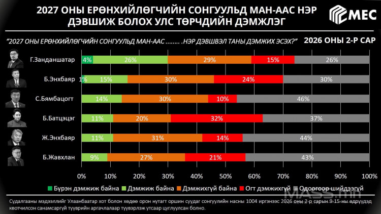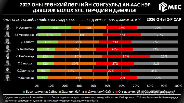 Улс төрчийн үнэлгээ дүнг судалж, зарлаж ирсэн МЭК судалгааны байгууллага ирэх жил ерөнхийлөгчийн сонгуульд нэр дэвших магадлалтай улс төрчдийн дунд рэйтинг судалгаа хийжээ. Тус байгууллагаас “Ерөнхийлөгчийн 2027 оны сонгуульд нэр дэвшиж болох улстөрчдийн дэмжлэг” агуулгын хүрээнд Улаанбаатар хот, хөдөө орон нутгийн сонгуулийн насны 1004 иргэнийг хамруулж энэ сарын 9-15-нд квотчилсон санамсаргүй түүврийн аргачлалаар саналыг цуглуулсан байна.