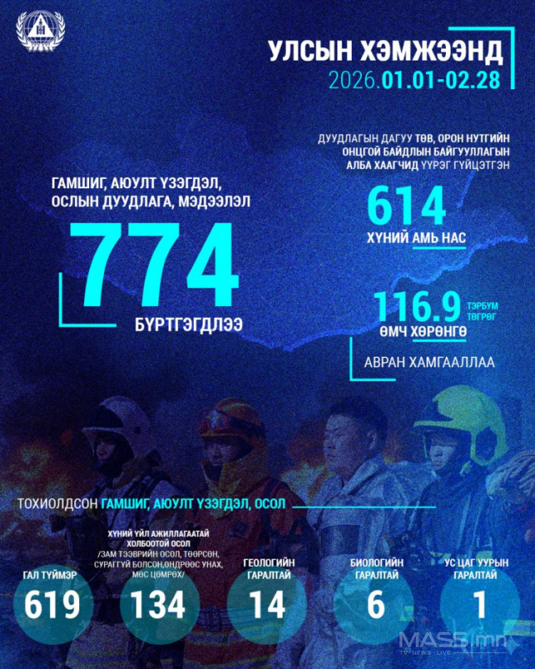 Улсын хэмжээнд он гарсаар хоёрдугаар сарын байдлаар 774 удаагийн гамшиг, аюулт үзэгдэл, ослын дуудлага, мэдээлэл бүртгэгдлээ.