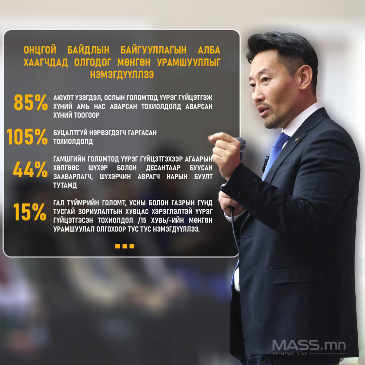 - Гал түймрийн голомт, усны болон газрын гүнд тусгай зориулалтын хувцас хэрэглэлтэй үүрэг гүйцэтгэсэн тохиолдол /15 хувь/-ийн мөнгөн урамшуулал олгохоор тус тус тусгасан.
