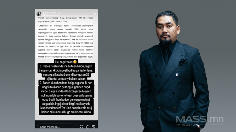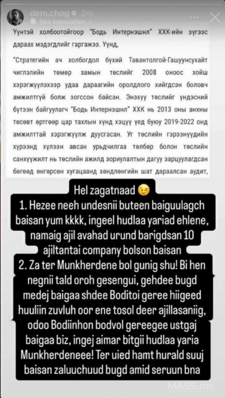 Тэрээр "Хэзээ нэг их үндэсний бүтээн байгуулагч байсан юм. Ингээд худлаа яриад эхэлнэ. Намайг ажил авахад өрөнд баригдсан 10 ажилтантай компани болсон байсан. Тэр Д.Мөнх-Эрдэнэ бол гуниг шүү. Би хэн нэгний талд орох гэсэнгүй. Гэхдээ бүгд мэдэж байгаа шүү дээ. “Бодь интернэшнл” ХХК-тай гэрээ хийгээд энэ төсөл дээр хуулийн зөвлөхөөр ажиллаж байсныг нь. Одоо “Бодь интернэшнл” ХХК-ийнхан гэрээгээ устгаж байгаа биз. Ингэж битгий худлаа ярь аа, Д.Мөнх-Эрдэнэ ээ. Тэр үед хамт хуралд сууж байсан залуучууд бүгд амьд сэрүүн байна" гэв.