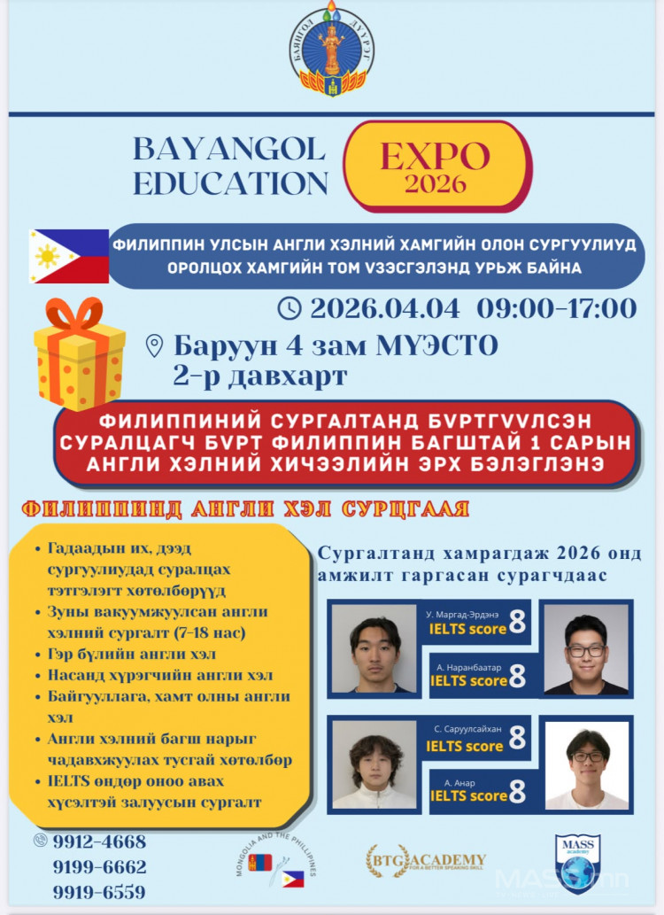 Баруун 4 зам МҮЭСТО, 2-р давхарт БАЯНГОЛ БОЛОВСРОЛ 2026 ЭКСПО болох гэж байна. Филиппиний англи хэлний сургалтанд бүртгүүлсэн суралцагч бүрт Монголдоо 1 сар гадаад багштай англи хэл сурах эрх бэлгэлнэ. Экспод очсоноор