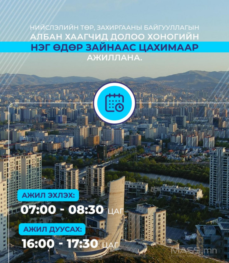 Мөн төрийн байгууллагын үйл ажиллагааны хэвийн, тасралтгүй, шуурхай байдлыг алдагдуулахгүйгээр ажлын зайлшгүй шаардлагаас бусад тохиолдолд нийслэлийн төр, захиргааны байгууллагын албан хаагчид 2026 оны 4 дүгээр сарын 20-ны өдрөөс долоо хоногийн нэг өдөр зайнаас цахимаар ажиллана.