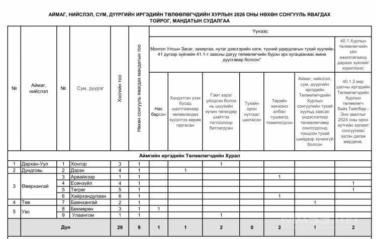 Аймаг, нийслэл, сум, дүүргийн иргэдийн Төлөөлөгчдийн Хурлын нөхөн сонгууль зохион байгуулах аймаг, сумдыг мэдээллийг хүргэж байна.