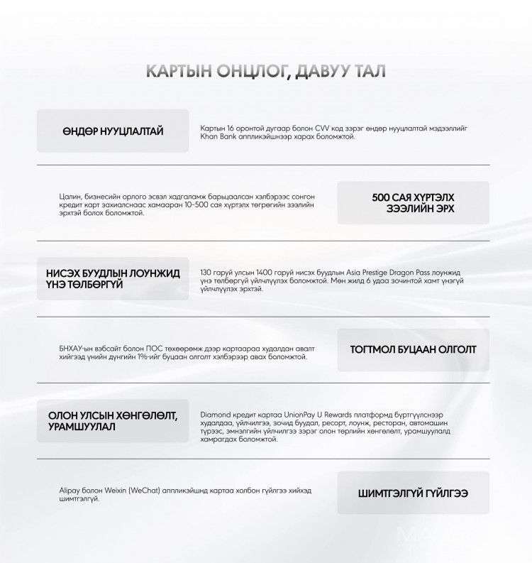 Энэхүү металл карт нь чамин хийц, тансаг хэрэглээг илэрхийлээд зогсохгүй харилцагчийн хэрэгцээнд нийцсэн санхүүгийн онцгой боломжуудыг санал болгож буй юм.