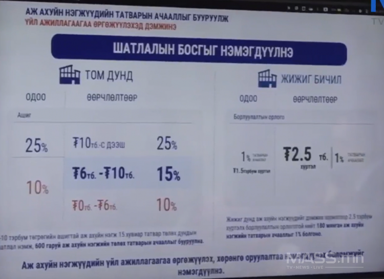 ЖДҮ-г дэмжих зорилгоор 1.5 тэрбум төгрөгийн борлуулалттай байвал нэг хувийн татвар ногдуулж байгаа босгыг нэмж, 2.5 тэрбум төгрөг болгох заалт орсон. Ингэснээр 180 мянга гаруй ААН-ийн татварын ачааллыг нэг хувь болгон бууруулна" гэлээ.