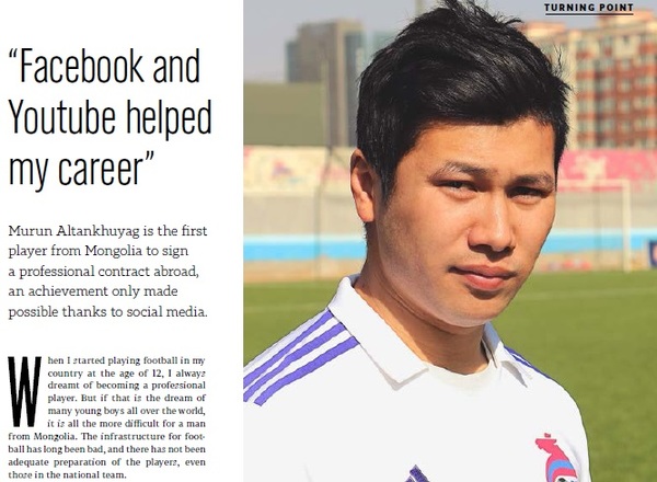 Алтанхуягийн Мөрөн бол Монголын анхны мэргэжлийн хөлбөмбөгчин. Сонирхолтой нь тэрбээр сошиал медиагийн туслалцаатайгаар хилийн чанадад тоглох гэрээг анх үзэглэсэн гэдэг. Олон улсын хөлбөмбөгийн холбооны долоо хоног тутмын “The FIFA Weekly” сэтгүүл дээр гарсан түүний тухай нэгэн нийтлэлийг орчуулан хүргэе.