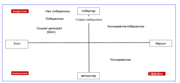 Угтаа бол либерализм барууны биш, бүр зүүний үзэл баримтлал юм шүү дээ. Эд хашгичсаар байгаад өөрсдөө хүртэл либерализм бол ардчиллын цорын ганц тодорхойлолт гээд буруу андуурчихсан. Зөвхөн би болж байвал, хувь хүн болж байвал бусад нь хамаагүй гэж ойлгодог либерализм анархизмд хүрэхэд ердөө хоёрхон хуруу зай бий. Тэгтлээ даган дууриагаад байгаа АНУ-д ч хүртэл либерал үзэлтнүүд нь зүүнийх, харин консервативууд нь барууных гэж ойлгодог. АНУ-ын Ерөнхийлөгч Дональд Трамп ч бас барууны консерватив намын төлөөлөгчийн хувьд неолиберализмаас татгалзаж эхэллээ. Либерализмын нөлөөгөөр үйлдвэрүүд нь гадагш шилжиж, ажилгүйдэл ихсэж, эдийн засаг сульдсан нөхцөлд арай баруун чигийн нам болох консерватив нам нь яллаа. Манайхаас ялгаатай нь тэнд коммунист нам байхгүй. Дэлхий нийтийн нийтлэг ойлголтоор бол улс төрийн үзлийн орон зай дотор либералистуудыг хэт зүүний талыг баримтлагч гэж нэрлэх нь ч бий. Америкийн улс төрийн баримжаагаар либерал нам нь зүүний тал.