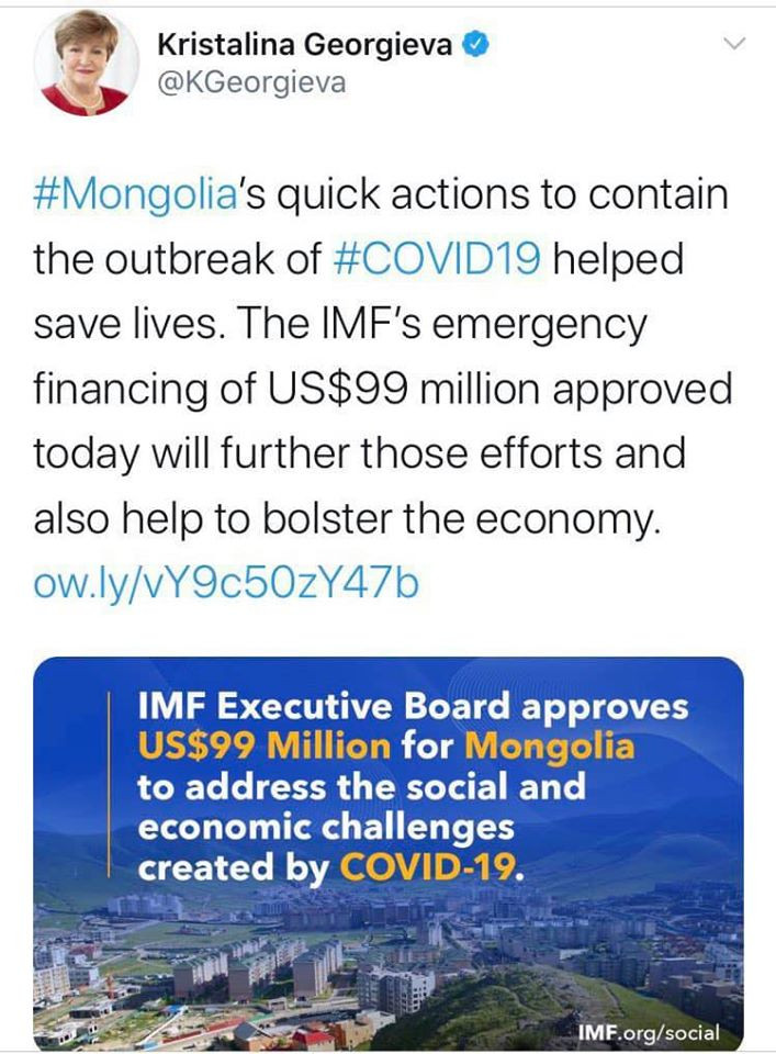 ОУВС-н Захирал Кристалина Георгиева монгол улсад олгосон санхүүжилтийн талаар өөрийн твитеер хуудаснаа: Монгол Улс Covid19-с хамгаалах чиглэлд шуурхай арга хэмжээ авсан нь олон хүний амь насыг эрсдэлд оруулахаас хамгаалсан. ОУВС-гаас олгож буй 99 сая $-н санхүүжилт нь дээрх арга хэмжээнүүдээ үргэлжлүүлж,эдийн засгаа тэтгэхэд тус нэмэр болно хэмээн мэдэгдсэн байна.
