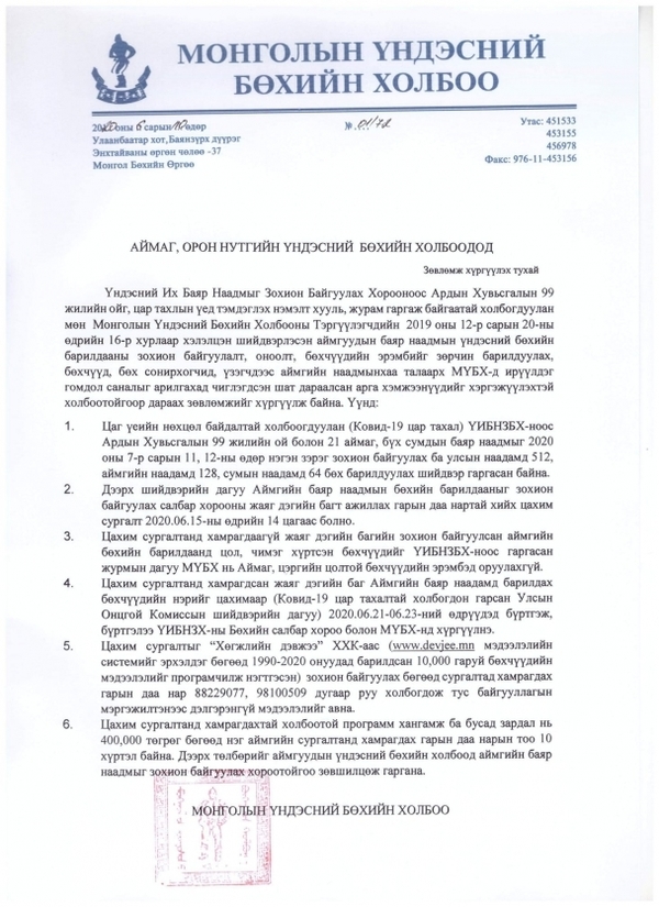 Коронавирусийн халдвараас сэргийлэх зорилгоор Үндэсний их баяр наадмыг орон даяар нэг зэрэг зохион байгуулахаар шийдвэрлэсэний дагуу МҮБХ-ноос мэдэгдэл гаргалаа.