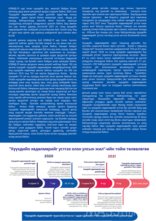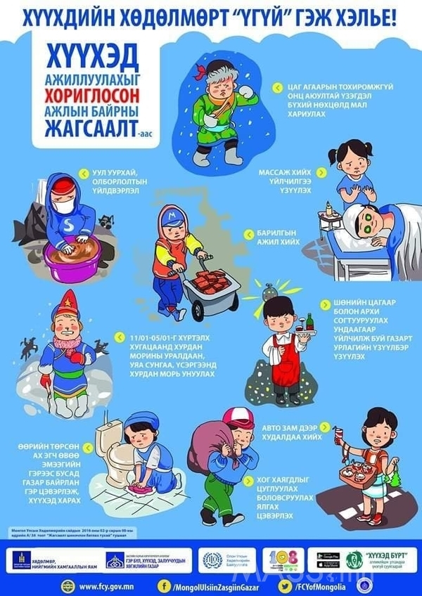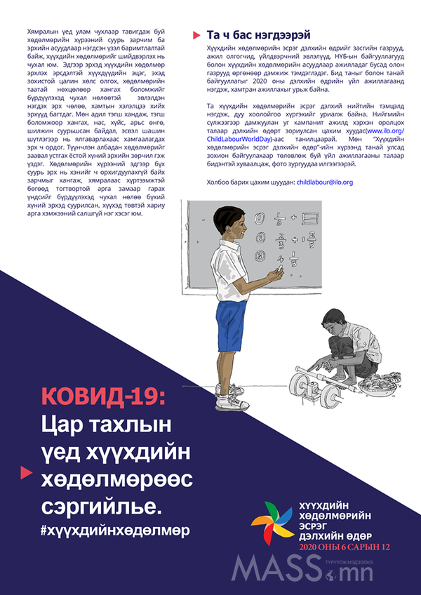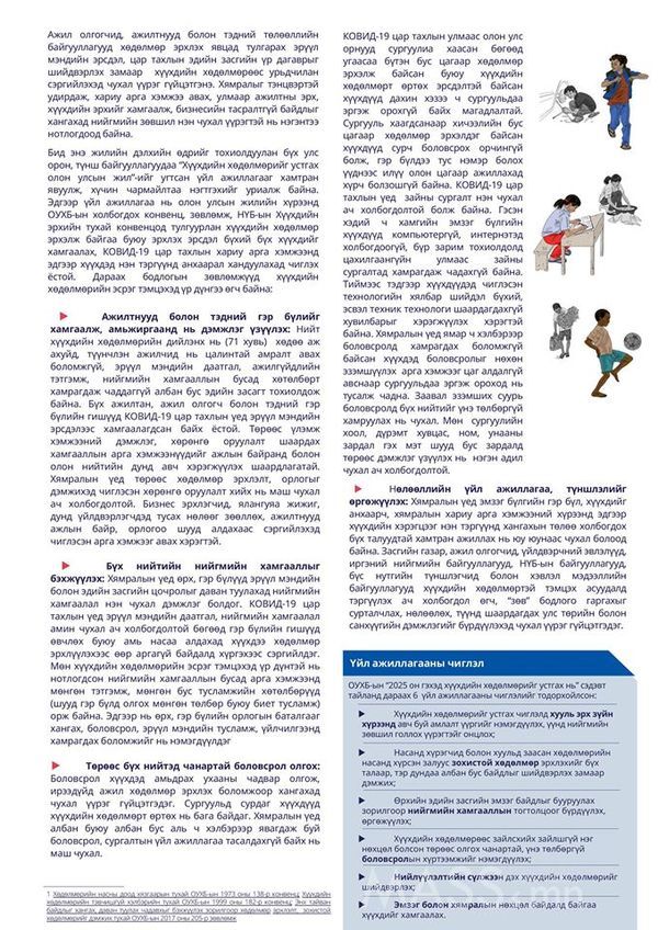 НИЙСЛЭЛИЙН ГЭР БҮЛ, ХҮҮХЭД ЗАЛУУЧУУДЫН ХӨГЖЛИЙН ГАЗРААС: ОУХБ-ын холбогдох конвенц, зөвлөмж, НҮБ-ын Хүүхдийн эрхийн тухай конвенцод тулгуурлан хүүхдийн хөдөлмөр эрхэлж байгаа буюу эрхлэх эрсдэл бүхий бүх хүүхдийг хамгаалах, КОВИД-19 цар тахлын хариу арга хэмжээнд эдгээр хүүхдэд нэн тэргүүнд анхаарал хандуулахыг бүх нийтэд уриалж байна.