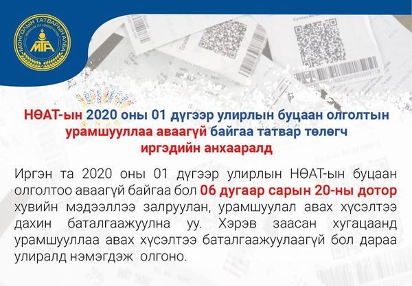 НӨАТ-ын 2020 оны 01-р улирлын буцаан олголт аввагүй иргэд энэ сарын 20-ны /2020.06.20/ дотор хувийн мэдээллээ залруулан, урамшуулал авах хүсэлтээ дахин баталгаажуулахыг Татварын албанаас мэдээллээ. Хэрэв заасан хугацаанд урамшууллаа авах хүсэлтээ баталгаажуулаагүй бол дараа улиралд нэмэгдэж олгох юм байна.
