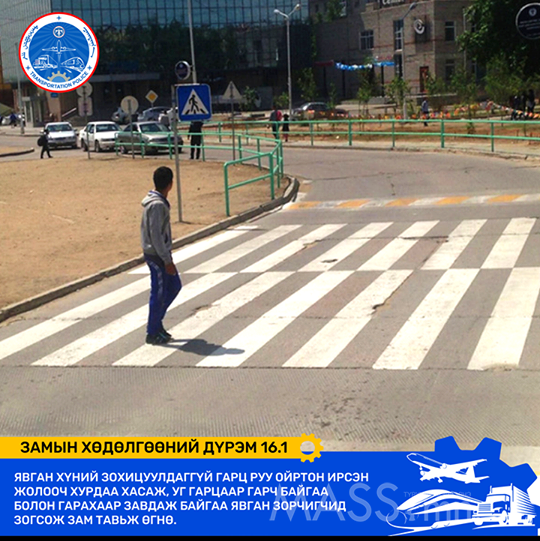 Иймд явган зорчигч ТА явган хүний гарц гармаар зам хөндлөн гарах, үзэгдэх хүрээнд явган хүний гарц гарам байхгүй тохиолдолд ирж яваа тээврийн хэрэгслийг өнгөрүүлэн эгц зам хөндлөн гарах, замын хөдөлгөөнд оролцогч ЖОЛООЧ ТА явган хүний гарц дээр явган зорчигчид ЗАМ ТАВЬЖ өгч байхыг Тээврийн цагдаагийн албанаас анхааруулж байна.