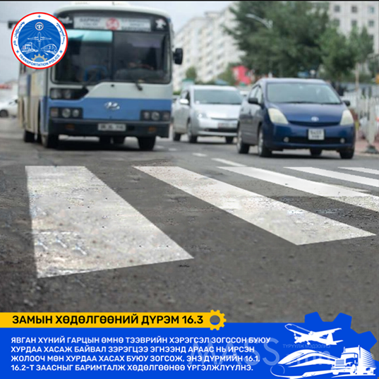 Тээврийн цагдаагийн албанаас явган зорчигчийг зам тээврийн осолд өртөхөөс урьдчилан сэргийлэх зорилгоор “Гарцаараа гарцгаая” хэсэгчилсэн арга хэмжээний хүрээнд Замын хөдөлгөөний дүрмийн 16 дугаар бүлэг “Явган хүний гарц нэвтрэх”-д жолоочийн баримтлах заалтын хэрэгжилтийг ханган ажиллаж байна.