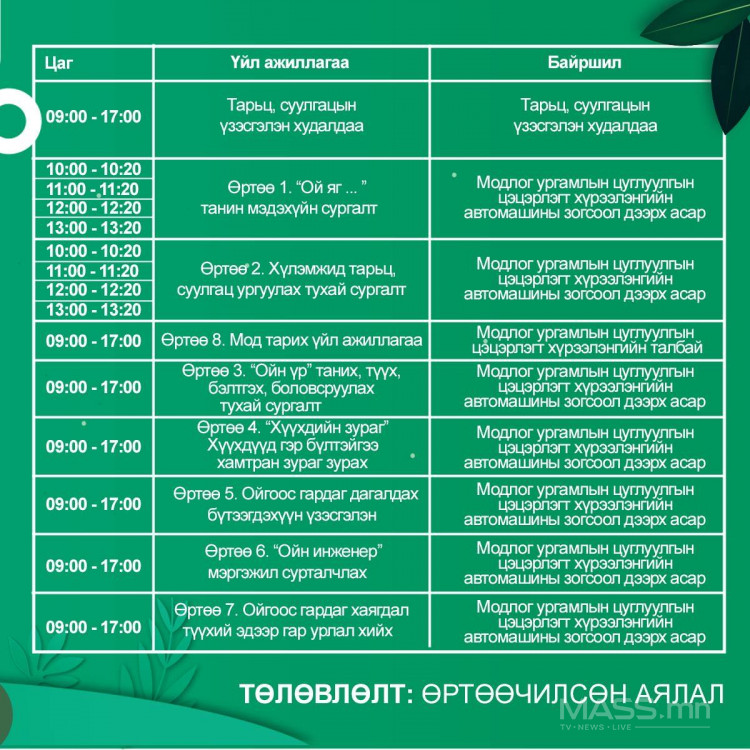Өртөөчилсөн аялал найман чиглэлээр явагдах бөгөөд өртөө бүрээс ой модтой холбоотой сонирхолтой мэдээллийг авч болно. Тухалбал: Мэргэжлийн мод үржүүлэгчдийн тарьц, суулгацын үзэсгэлэн худалдаа, Хүлэмжид тарьц, суулгац ургуулах практик сургалт, “Ойн үр” таних, түүх, бэлтгэх, боловсруулах, Мэргэжил сурталчлах, “Ойн үнэр” тайвшруулах хэсэг, сонирхолтой биологи – танин мэдэхүйн өртөө, хүүхдүүд гэр бүлтэйгээ хамтран зураг зурах орчин бүрдүүлэх,” Ой яг түүн шиг” сургалт зэрэг багтаж байна. Мөн нийслэл хотод 05 дугаар сарын 11-18-ны өдрүүдэд найман байршилд мод тарих бөгөөд 300 гаруй байгууллага оролцоно. Мөн модлог ургамлын тарьц, суулгацын үзэсгэлэн худалдааг нийслэлд гурван байршилд /Тэнгэр плаза, Модлог ургамлын цуглуулгын цэцэрлэг, Ялалтын талбай/ 21 аймаг, сумдад зохион байгуулж, тарьц, суулгацаар ханган, заавар, зөвлөмж өгөх юм.